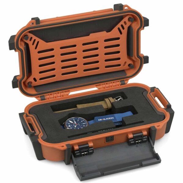 Il packaging di questo orologio non delude le aspettative. Ogni Khaki Aviation Pilot Air-Glaciers è consegnato in una speciale Pelicase R40, una custodia robusta e resistente che riflette lo spirito avventuroso del segnatempo. Questo tipo di confezione non solo protegge l'orologio durante il trasporto, ma aggiunge anche un elemento di praticità e stile che gli appassionati di orologi apprezzeranno.