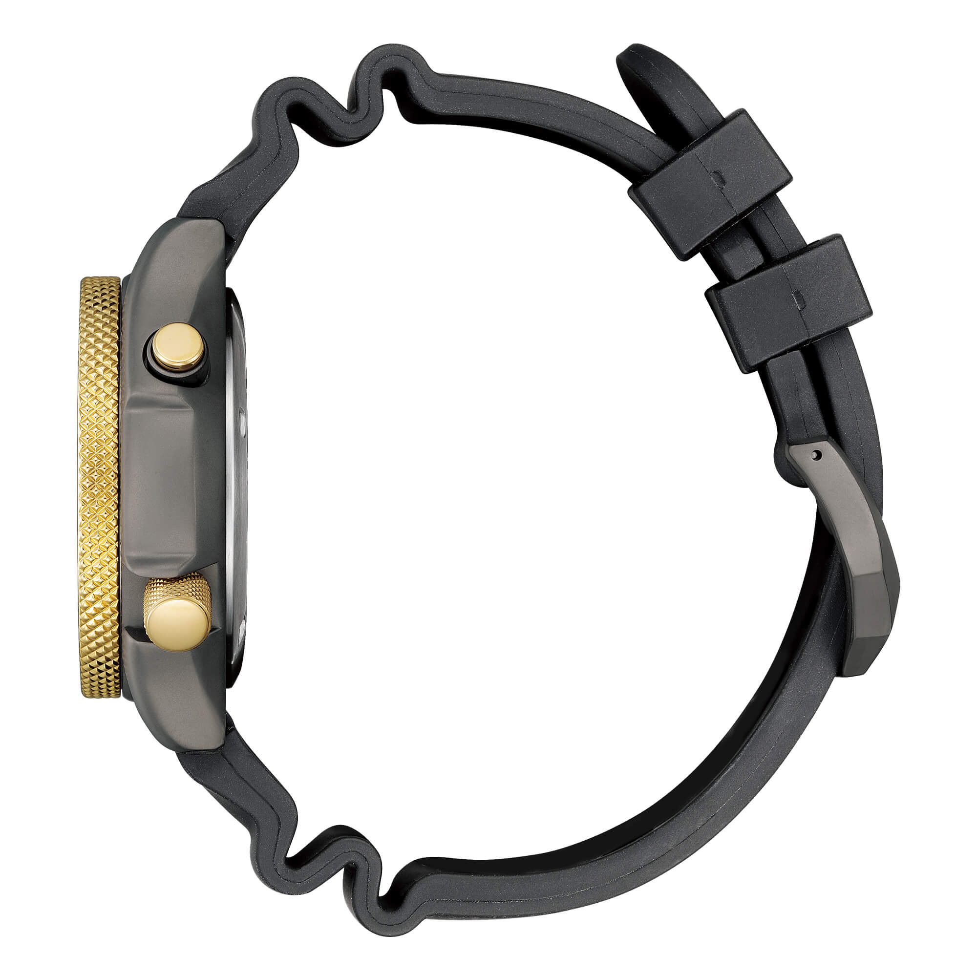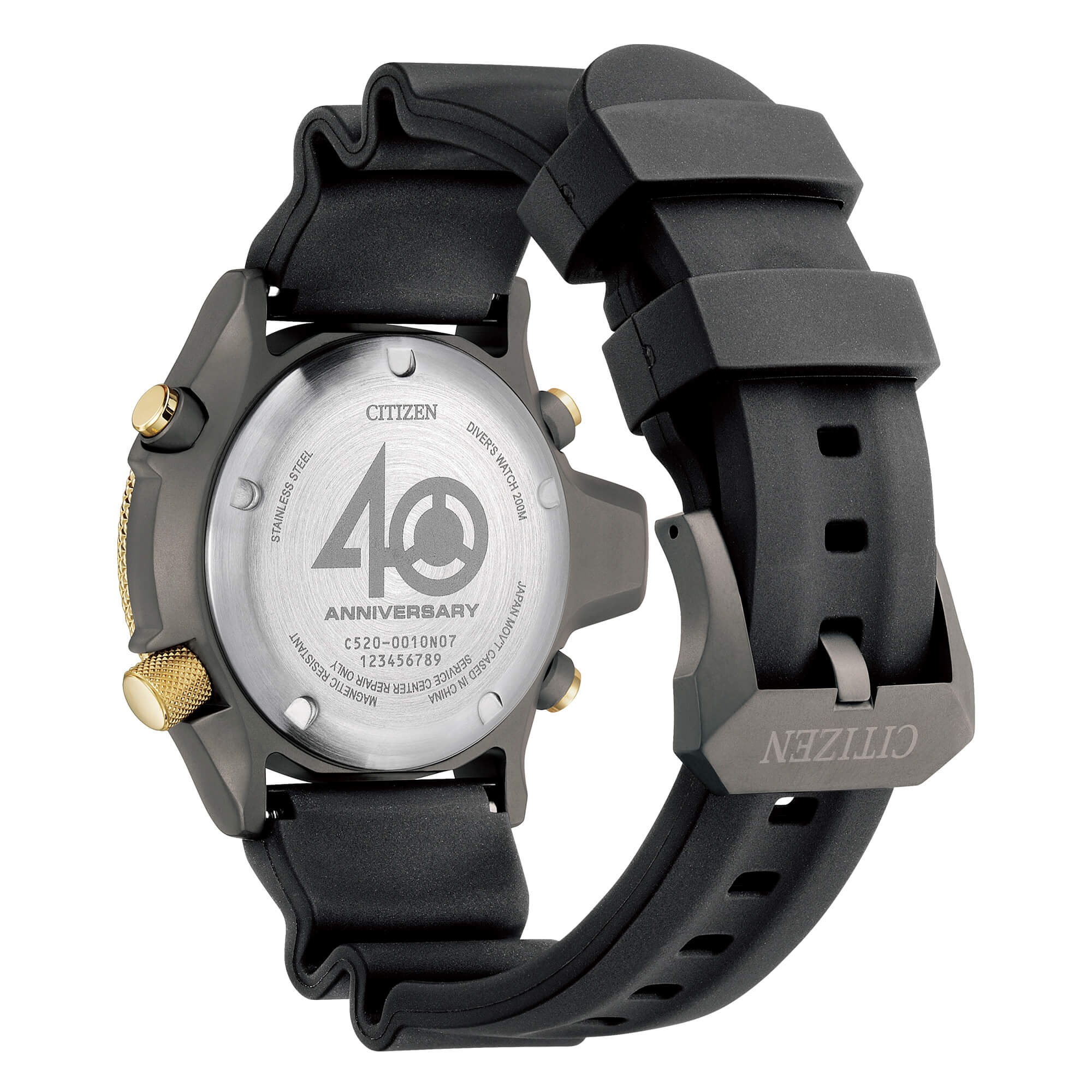 CARATTERISTICHE: Cassa in acciaio inossidabile con finitura grigia e dettagli dorati. Cinturino in BENEBiOL™, poliuretano di origine vegetale. Fondello celebrativo con incisione del logo 40° Anniversario. Indici e sfere ad alta visibilità. Fondo e corona serrati a vite. Ghiera girevole unidirezionale zigrinata. Vetro minerale. WR 20 bar.