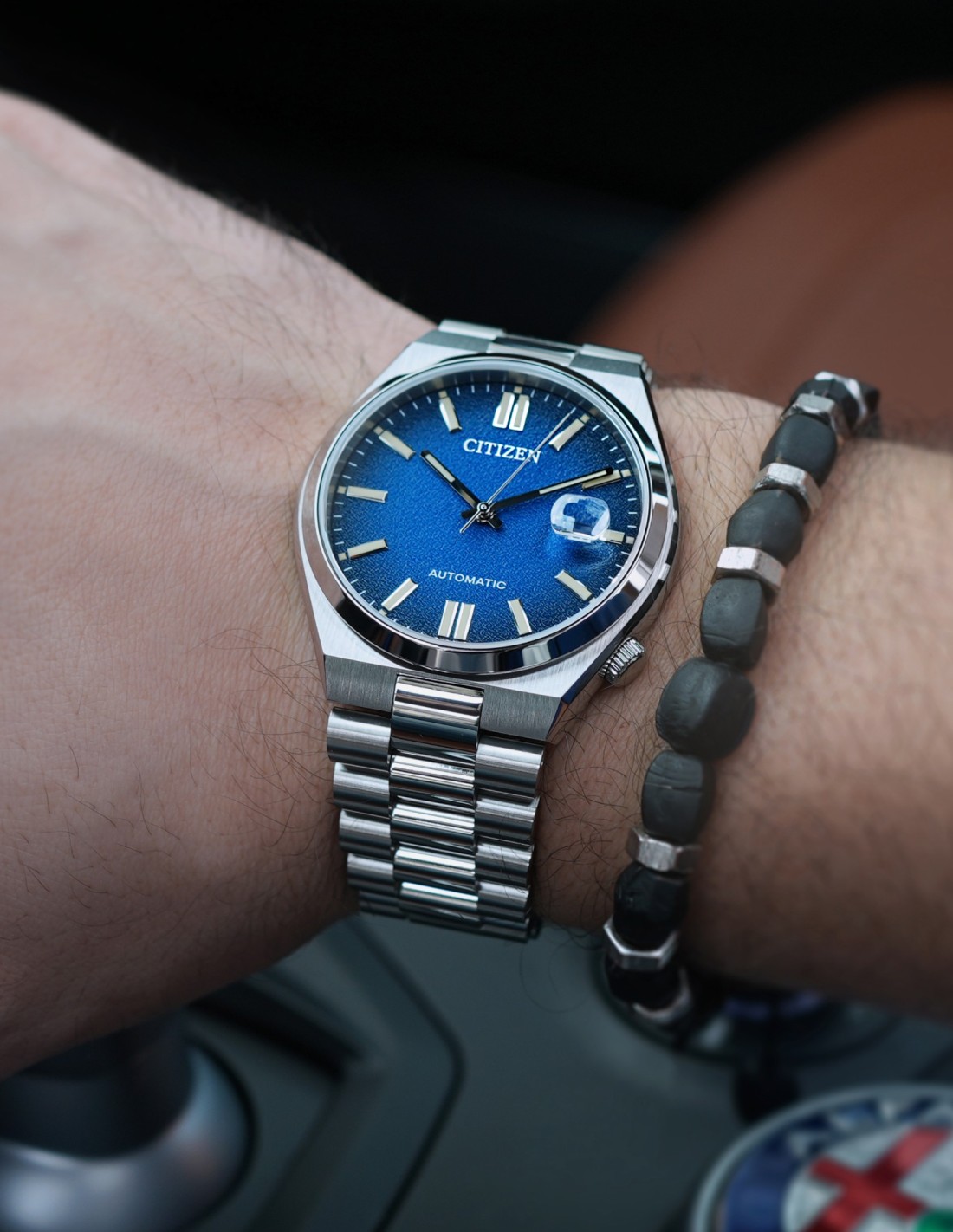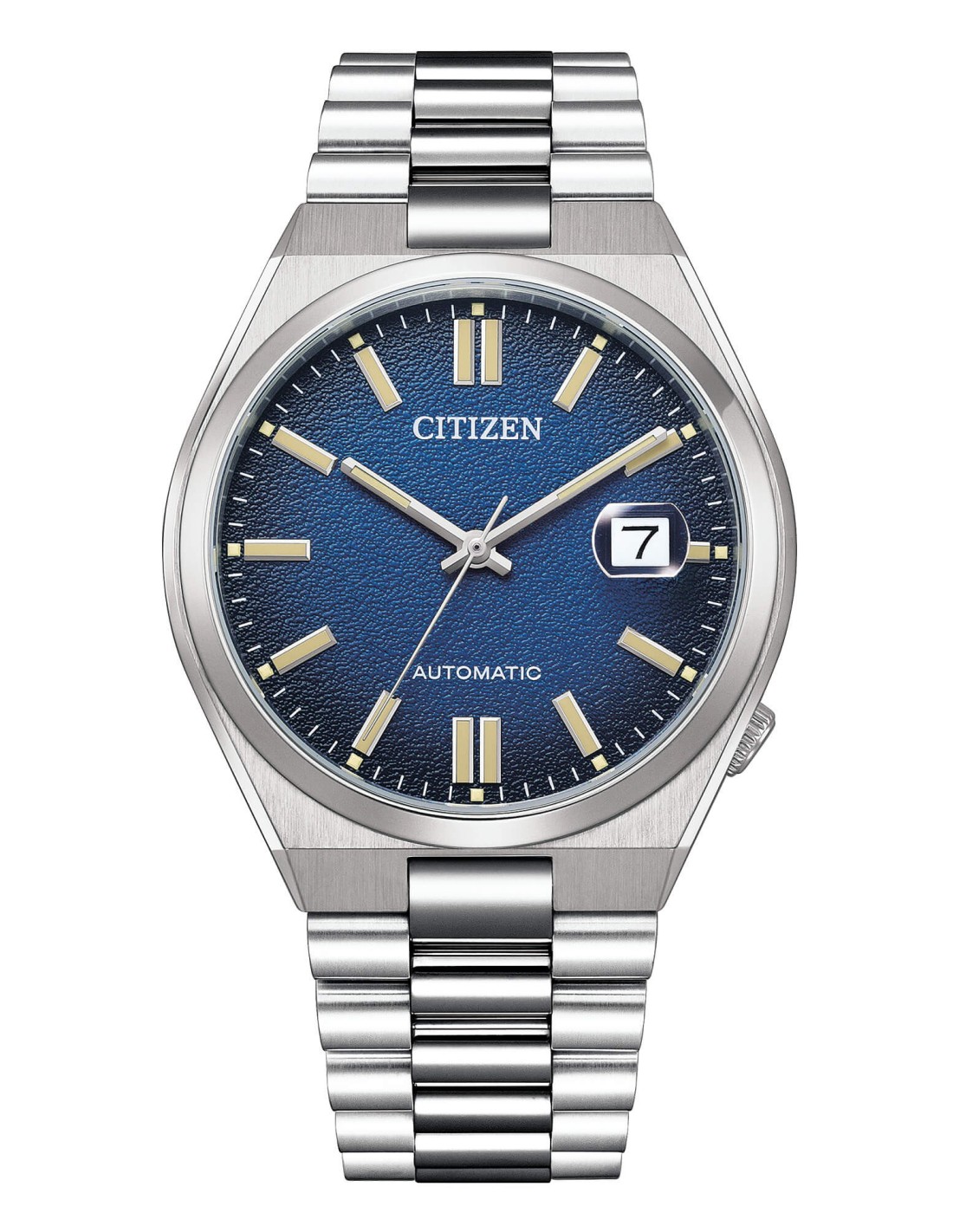 Quadrante blu scuro sfumato con indici e lancette luminescenti. Datario a ore 3.