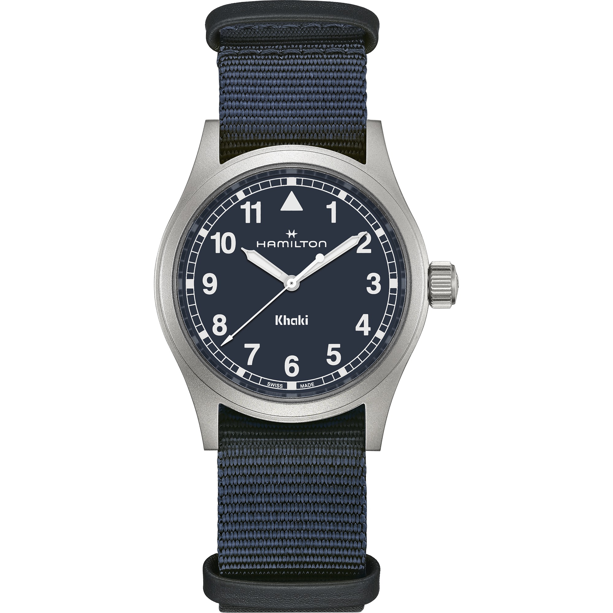 Il Khaki Field Quartz incarna la tradizione militare Hamilton tramite la semplicità del suo design. Sul quadrante spicca un font chiaro con numeri arabi ben dritti e una minuteria a binario. La palette cromatica è sobria: un quadrante blu raffinato messo in risalto da indici in Super-LumiNova® bianco. Perfetto per le tue avventure all'aria aperta, l'orologio è provvisto di un cinturino blu in tessuto NATO con passanti in pelle blu.