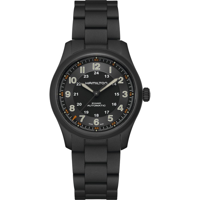 Caratterizzato da una cassa in titanio e bracciale con rivestimento in PVD nero, il Khaki Field Titanium 38 mm è un orologio altamente versatile, perfetto per essere indossato in ogni occasione. Il quadrante nero dall’ottima leggibilità ti permette di tenere i tempi di tutte le tue avventure, mentre il bracciale presenta una finitura sabbiata che aggiunge robustezza e carattere al design militare. Abbinando leggerezza e funzionalità allo stile militare, il Khaki Field Titanium è il tuo fedele alleato nella ricerca di nuove esperienze.