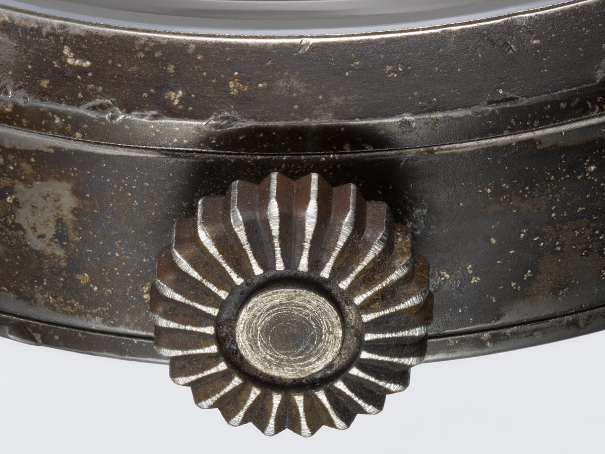Vetro zaffiro bombato e antiriflesso, fondello solido con incisione, esecuzione della corona come l'originale Beobachtungsuhr.