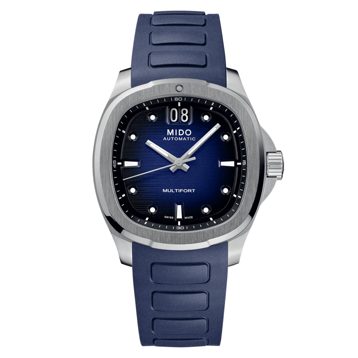 Un brillante ritorno di fiamma! Nata dallo straordinario patrimonio di MIDO, la cassa a forma di TV torna al centro della scena per il Multifort TV Big Date, tanto intenso quanto preciso, grazie al suo formidabile movimento meccanico. Il design moderno e dinamico di questo orologio svizzero è sottolineato da un quadrante spazzolato orizzontale di grande impatto e dalla sua funzione distintiva: la scritta BIG DATE a ore 12. Il suo formidabile movimento automatico di ultima generazione, il Calibro 80, è dotato di una spirale high-tech in Nivachron™ che offre un'eccezionale resistenza agli urti e ai campi magnetici.