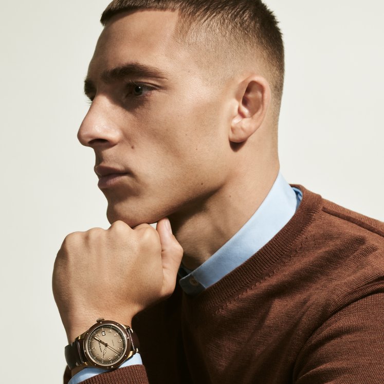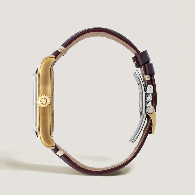 Montblanc 1858 Automatic Date 0 Oxygen è racchiuso in una cassa da 41 mm in bronzo totalmente priva di ossigeno. Presenta una lunetta fissa con inserto in ceramica marrone e punti cardinali luminescenti. Il fondello è decorato con una speciale incisione “Spirit of Exploration”. Il segnatempo è alimentato dal calibro automatico MB 24.17 ed è caratterizzato da un quadrante granulato sfumato marrone con numeri arabi finitura oro rosa bianchi luminescenti. Completa il modello un cinturino in pelle di vitello intercambiabile sfumato marrone con impunture beige.