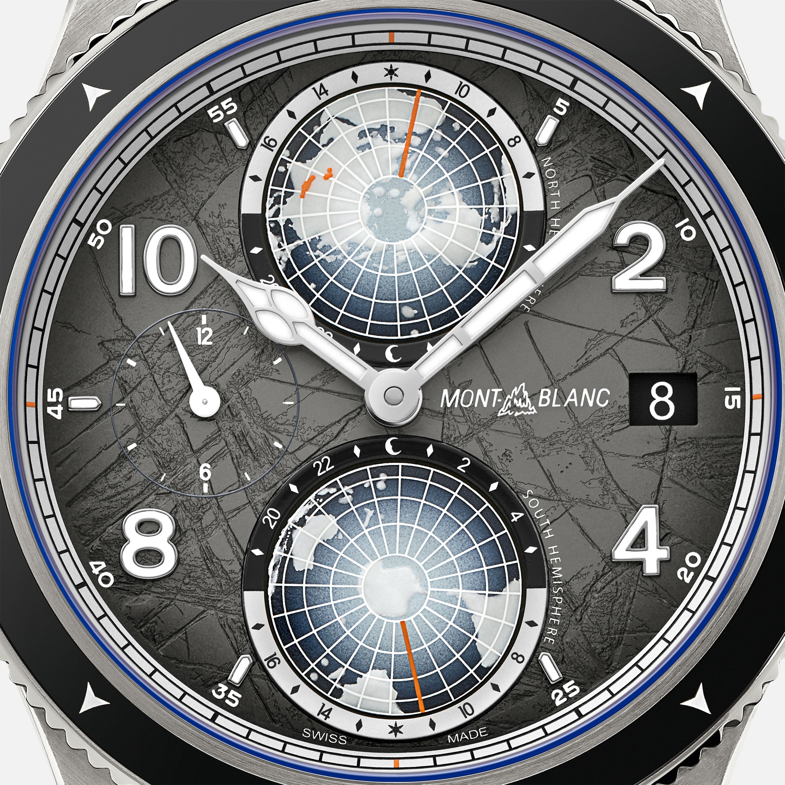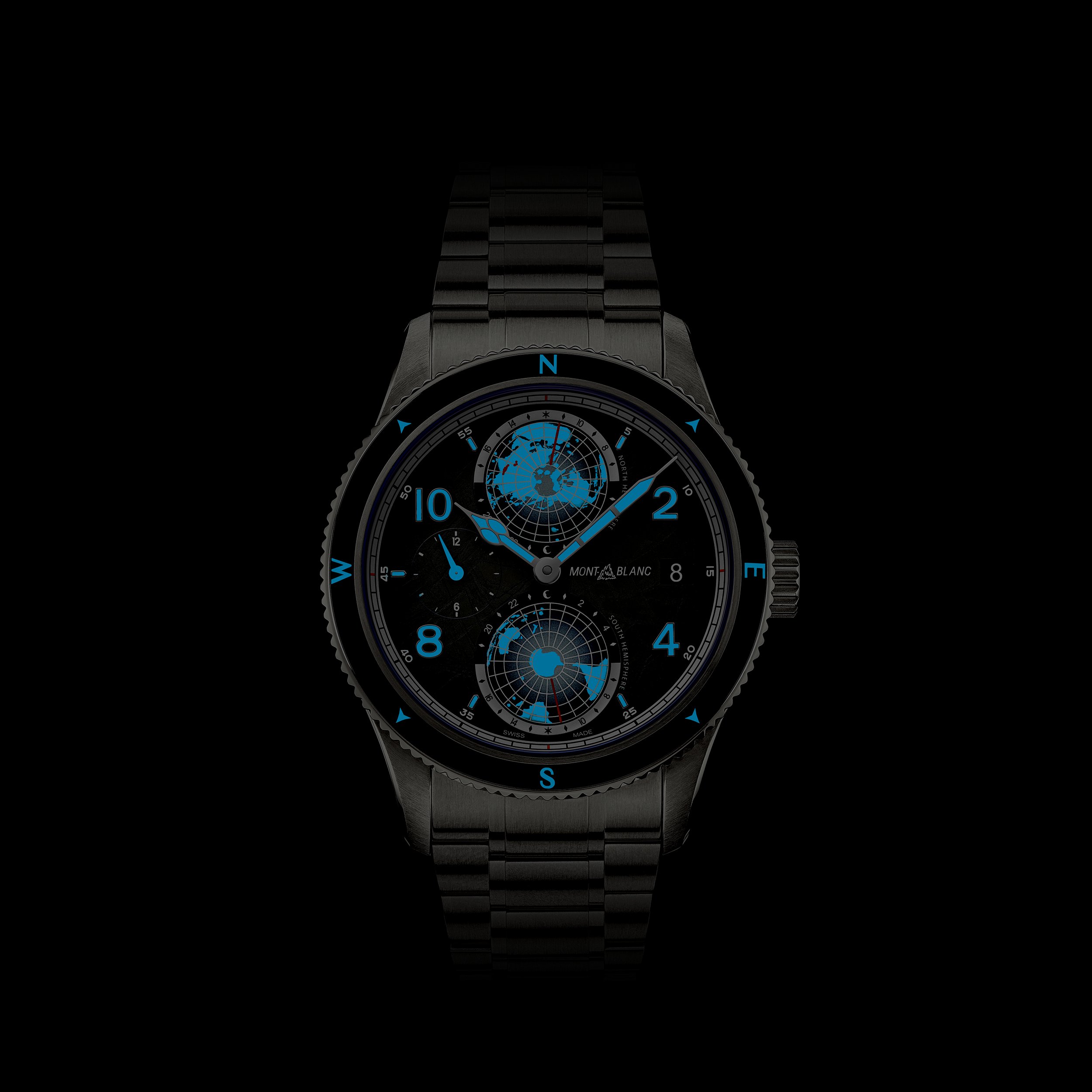 Il Montblanc 1858 Geosphere Chronograph 0 Oxygen The 8000 è alloggiato in una cassa in titanio di 42 mm totalmente priva di ossigeno. Questa innovazione comporta diversi vantaggi per gli esploratori, in quanto elimina l'appannamento e previene l'ossidazione, consentendo ai componenti del movimento di durare più a lungo con una precisione ancora più accurata.