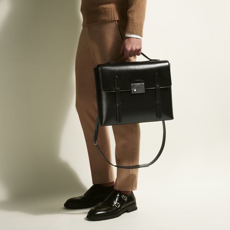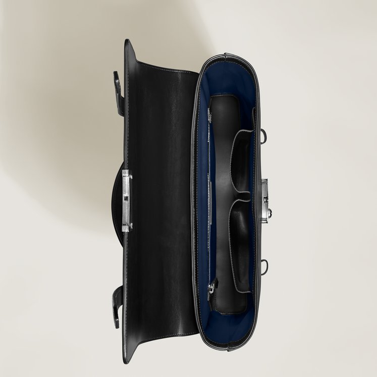 Ispirata all’arte della scrittura, la Cartella Meisterstück Neo spicca per il design moderno. Realizzata in una nuova tipologia di pelle nera estremamente lucida, presenta impunture e cursori delle cerniere e manici che richiamano la forma di un pennino, la vera essenza di Montblanc. Si distingue per la nuova chiusura con finitura palladio vintage, impreziosita da una versione più grande del logo, per un tocco luminoso. Il manico superiore in pelle, la tracolla in pelle amovibile e il sistema satellite offrono diverse opzioni di portabilità, mentre le tasche interne e la tasca posteriore esterna assicurano praticità.