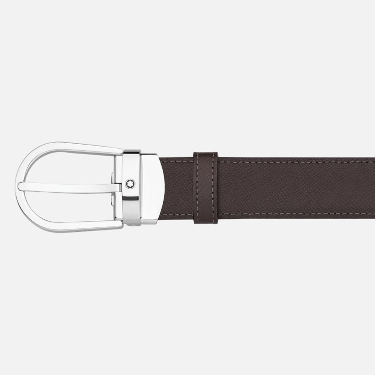 Fibbia ad ardiglione a ferro di cavallo in acciaio pregiato lucido con emblema Montblanc. Cinghia in pelle reversibile nera e marrone stampa Saffiano auto-regolabile, 3 cm x 120 cm.