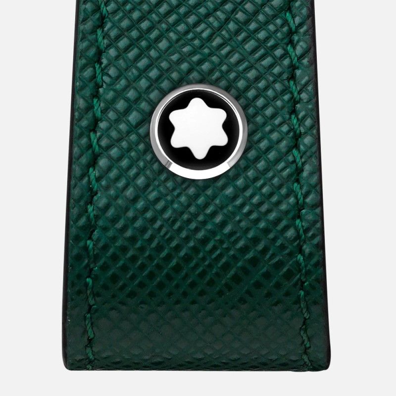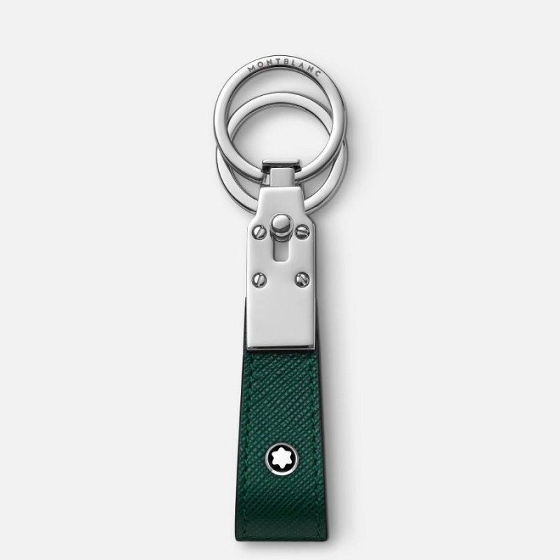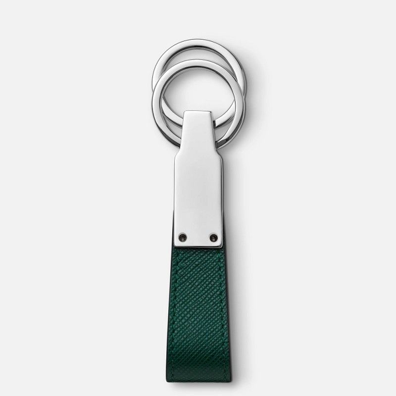 Portachiavi in pelle stampa saffiano di colore verdeĀ con emblema del brand, doppio anello in metallo di cui uno amovibile.
