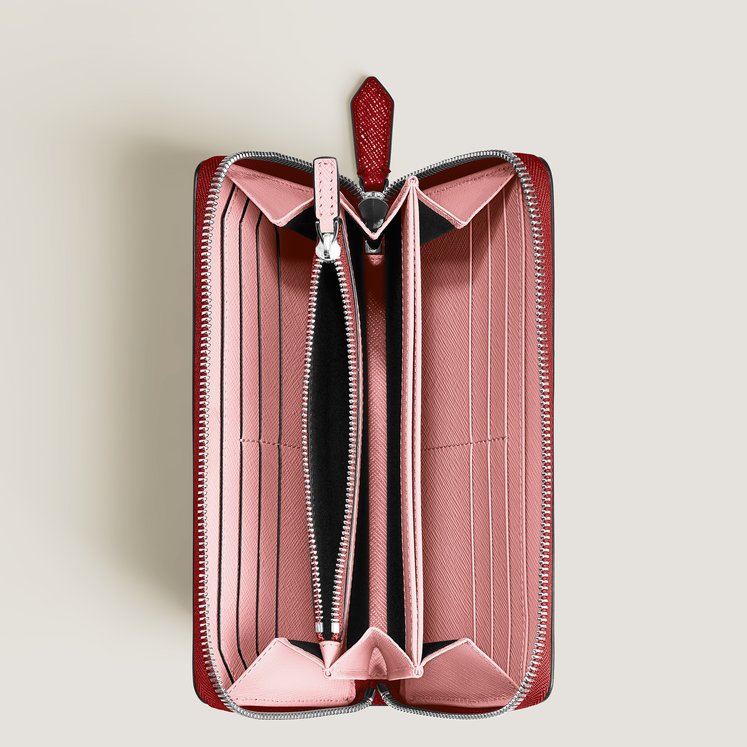 Questo raffinato e versatile portafoglio in pelle bicolore stampa Saffiano è stato sapientemente concepito con molteplici dettagli. Dispone di 12 aperture per carte di credito, tre scompartimenti per banconote, un portamonete con cerniera e tre tasche extra per gli oggetti più piccoli.