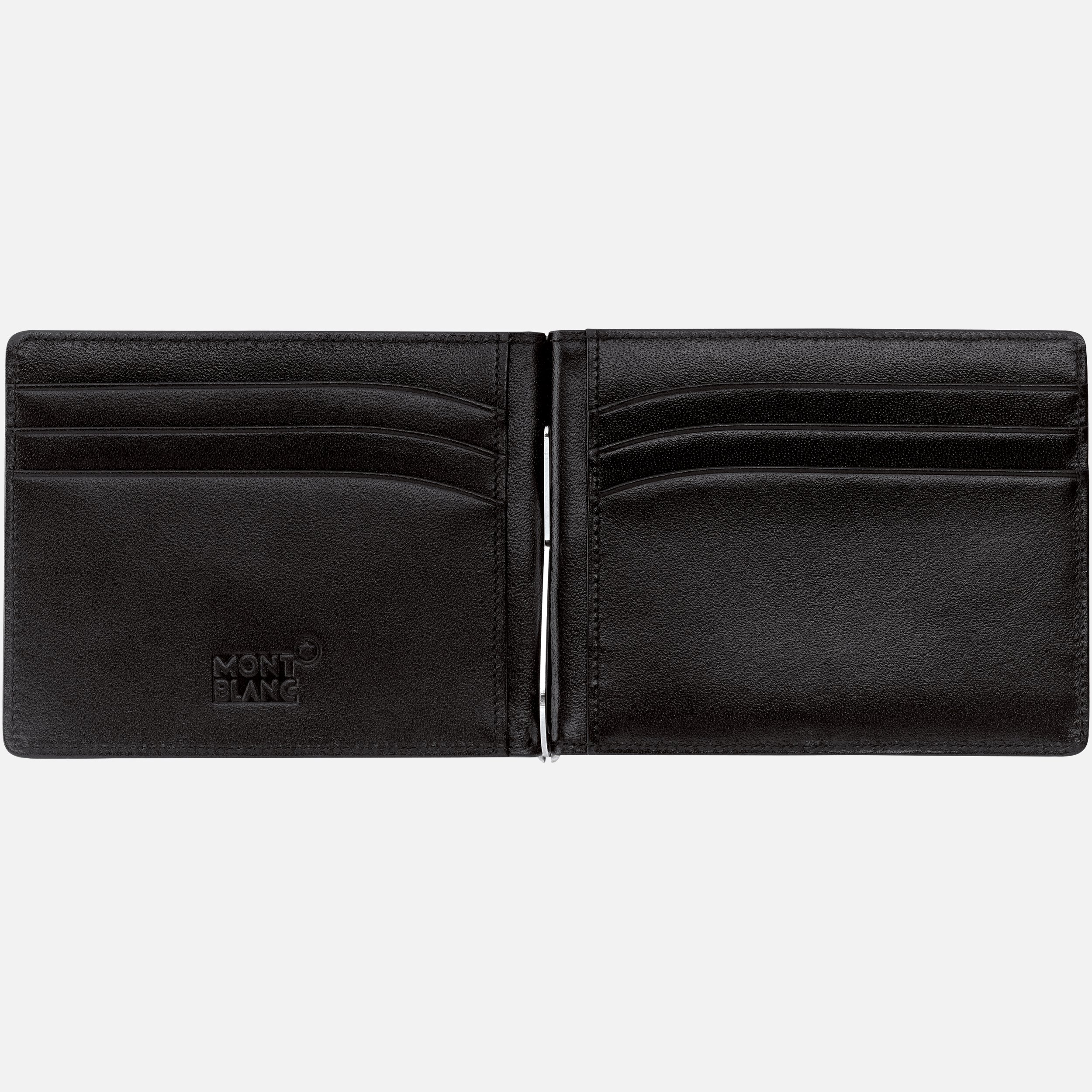 Portafoglio 6 scomparti, in pelle di vitello pieno fiore europea, nero lucido esclusivo Montblanc, fodera jacquard con marchio Montblanc, emblema Montblanc con anello finitura palladio, 6 tasche per carte di credito e fermasoldi