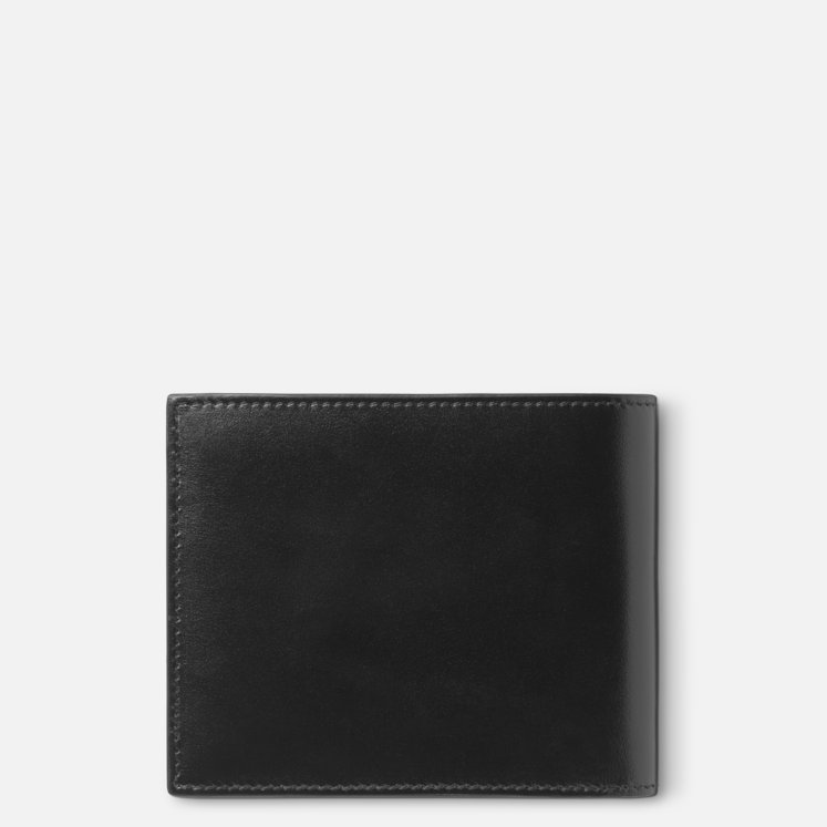 Portafoglio 4 scomparti in pelle bovina pieno fiore, nero lucido Montblanc, fodera jacquard con marchio Montblanc, emblema Montblanc con anello finitura palladio, 4 tasche per carte di credito, 2 scomparti per banconote, portamonete con patta