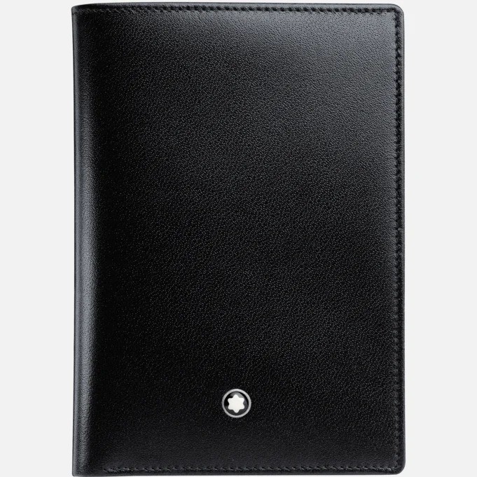 Portafoglio 4 scomparti in pelle di vitello pieno fiore europea, nero lucido esclusivo Montblanc, fodera jacquard con marchio Montblanc, emblema Montblanc con anello finitura palladio, 4 tasche per carte di credito, scomparto per banconote, 4 tasche extra