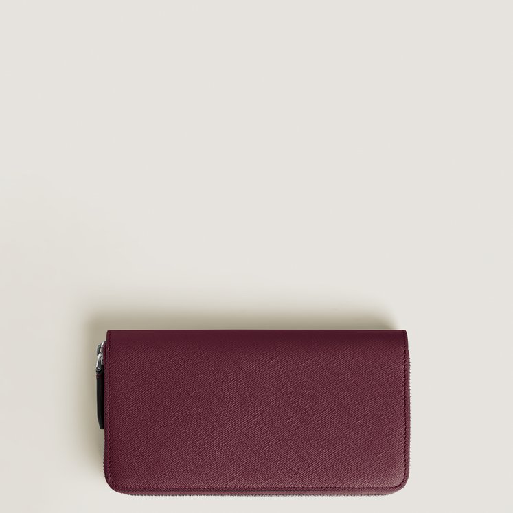 Questo portafoglio in pelle stampa Saffiano cassis è un accessorio versatile con numerosi dettagli funzionali. Oltre alle 12 fessure per carte di credito, presenta tre scomparti per banconote, un portamonete con cerniera e tre tasche aggiuntive per altri piccoli oggetti.