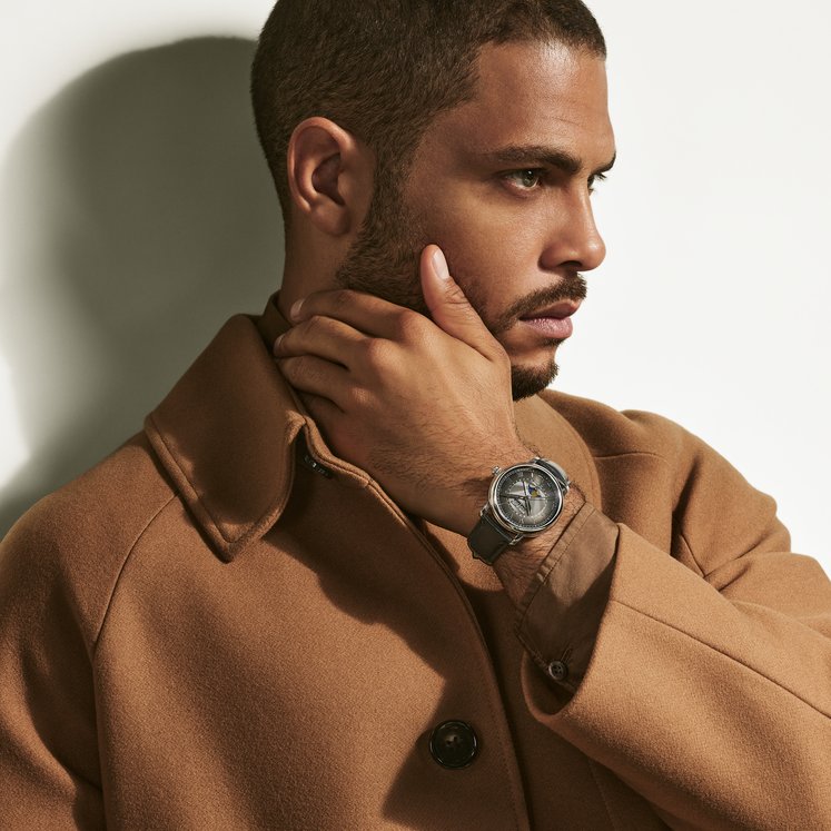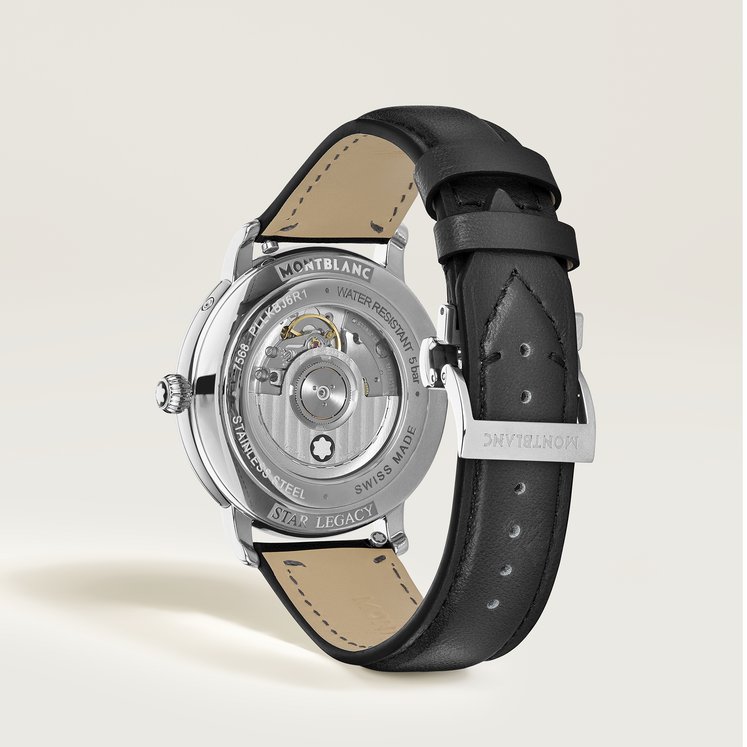 Montblanc Star Legacy Full Calendar eleva gli standard di eleganza dei codici di design raffinati della Maison. Il segnatempo presenta un quadrante sfumato antracite con motivo guilloché a stella variabile, filet sauté, numero romani finitura rodio, lancette a foglia e indica ore, minuti, secondi nonché giorno, data, mese e fasi lunari con uno stile semplicemente elegante. Questo modello è alimentato dal movimento automatico MB 24.30 ed è racchiuso in una cassa a forma di ciottolo da 42 mm in acciaio pregiato con fondello aperto che permette di contemplare la massa oscillante decorata con l’emblema Montblanc. Il cinturino intercambiabile in pelle di vitello antracite è stato disegnato dal Direttore Artistico di Montblanc Marco Tomasetta, che si è ispirato alla forma appuntita dei pennini degli strumenti da scrittura della Maison, esaltata da un effetto sfumato verticale.