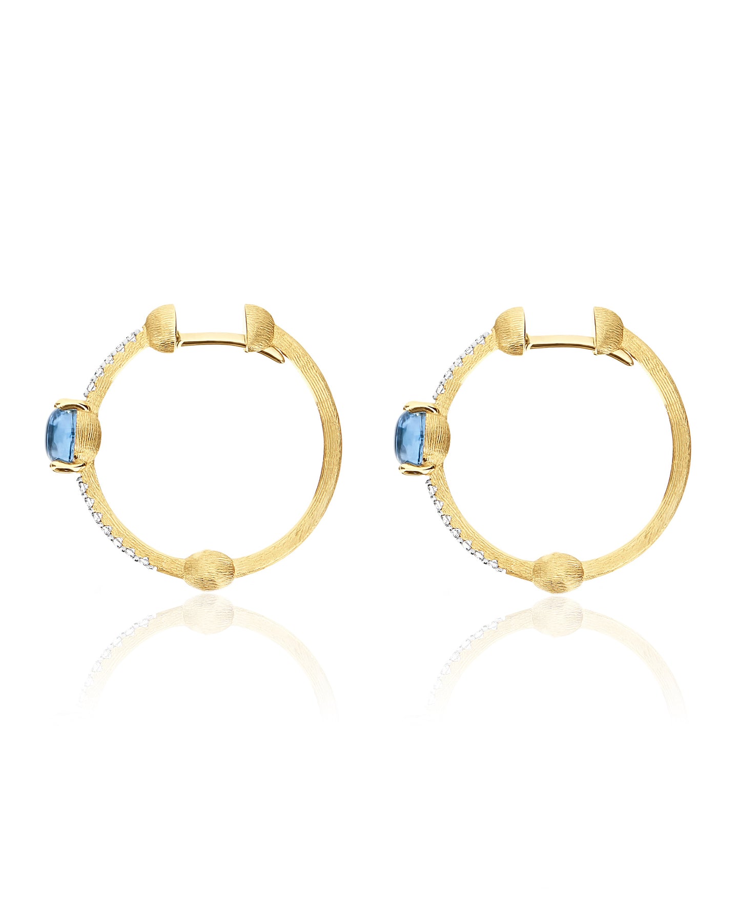 Leggeri, delicatissimi ed estremamente raffinati, questi orecchini a cerchio in oro 18kt realizzati a mano dai nostri artigiani sono dedicati al mare e ai suoi colori. La boule centrale in Topazio Blu London, è abbracciata da piccole rivières di diamanti, creano un gioco di luce e di riflessi dal fascino marino.