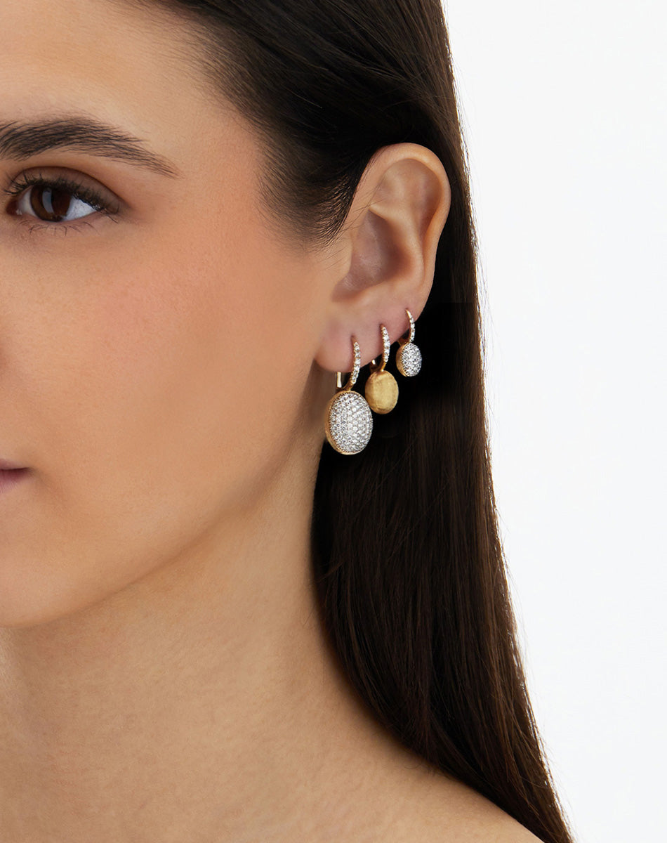 Due "ciliegine" in diamanti abbracciate dall’oro 18kt inciso a mano, capolavoro di artigianato artistico e di creatività.