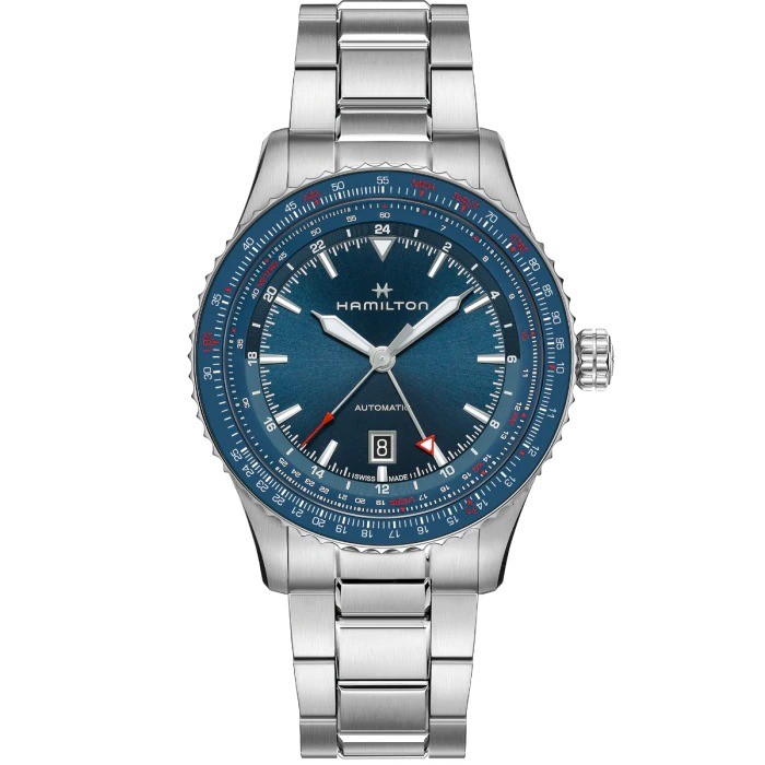 Con il Khaki Aviation Converter Auto GMT viaggiare in tutto il mondo è semplice. La lunetta girevole bidirezionale con regolo calcolatore converte unità e valute, mentre la funzione GMT garantisce la massima puntualità in ogni fuso orario. Con 80 ore di riserva di carica, questo sofisticato orologio da pilota da 44 mm ti porterà da una cabina di pilotaggio a una sala conferenze, sempre con stile.