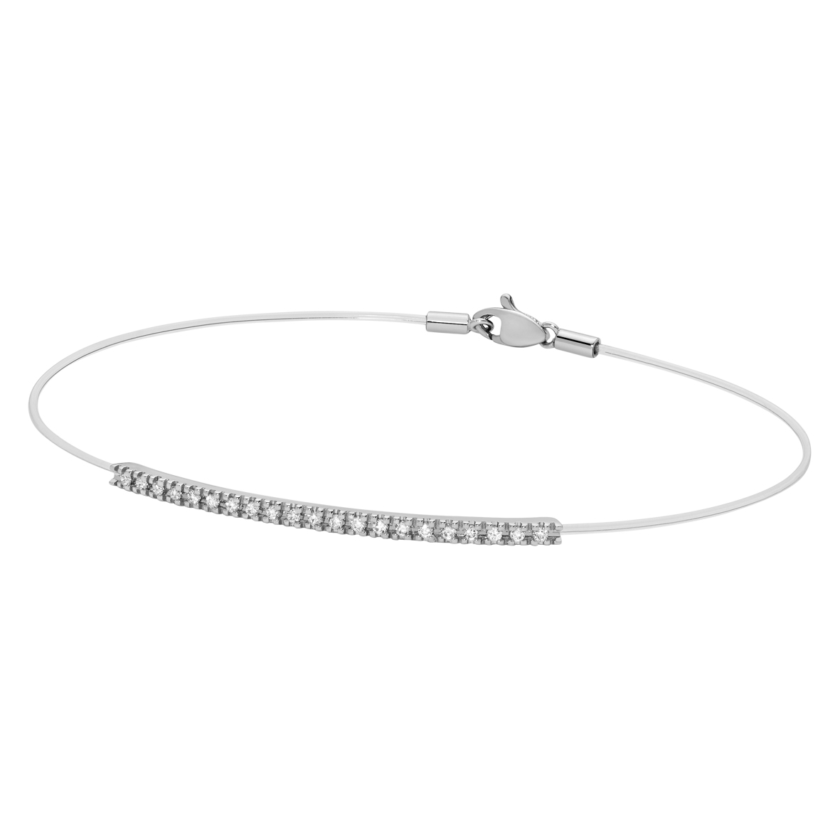 Bracciale con barretta tennis in oro bianco e diamanti realizzato in filo di nylon bianco e appartenente alla collezione Volée di Paddle Gioielli. Misura massima 21 cm con chiusura moschettone.