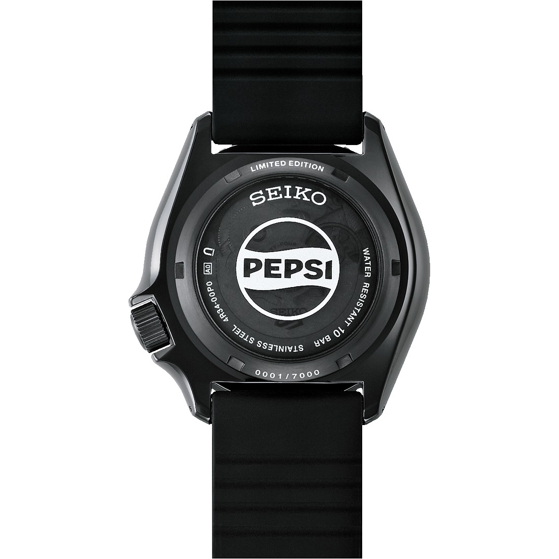 A ore 6 spicca il logo Pepsi originale dell’epoca, riprodotto fedelmente per trasmettere il linguaggio visivo di quegli anni. Il fondello trasparente rivela il movimento automatico Seiko 4R34, con il logo Pepsi al centro, l’incisione “LIMITED EDITION” e il numero di serie univoco.