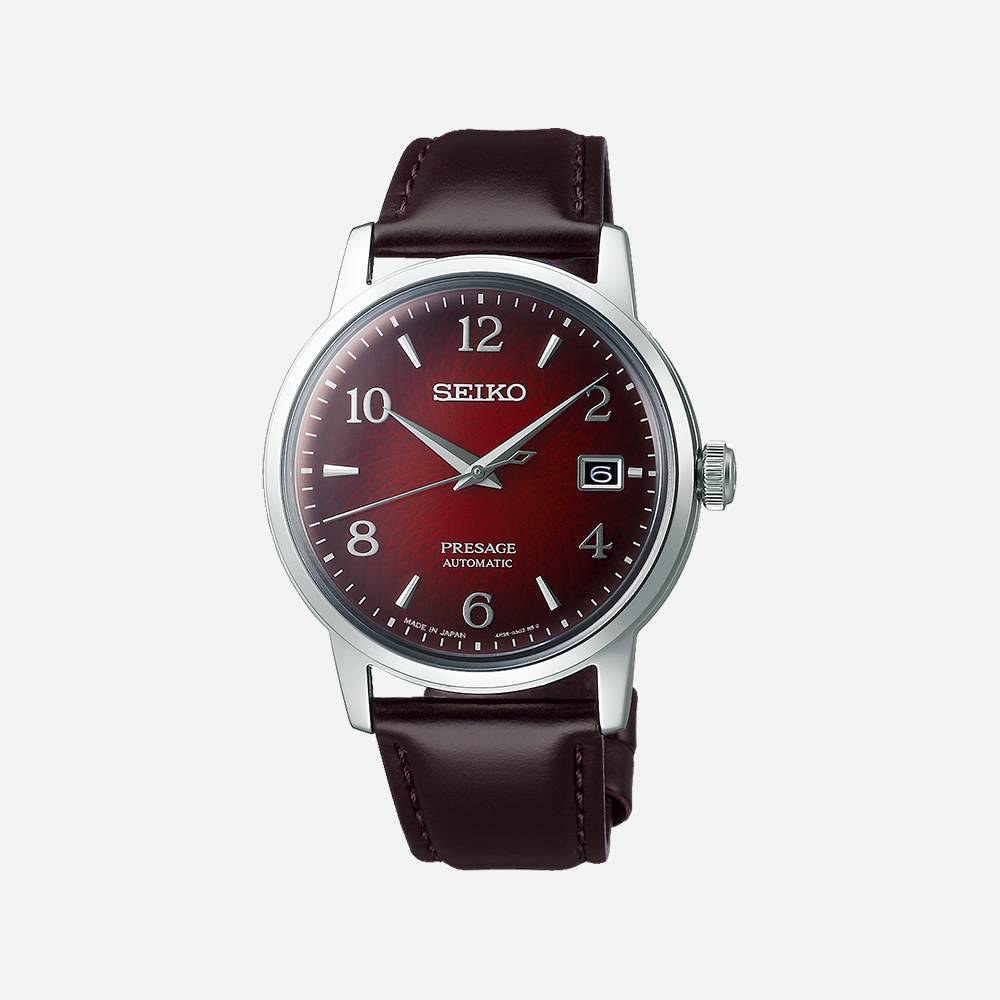 I modelli della collezione PRESAGE Cocktail si riconoscono facilmente per il quadrante testurizzato: la loro elegante semplicità estetica è in perfetta sintonia con la tradizione giapponese. Il rosso del quadrante del modello SRPE41J1 è ispirato al colore del cocktail Negroni, a base di gin, vermouth rosso e Campari. Accompagnato dal cinturino marrone in pelle per uno stile elegante, ma comodo, questo orologio automatico è semplicemente perfetto in ogni occasione.