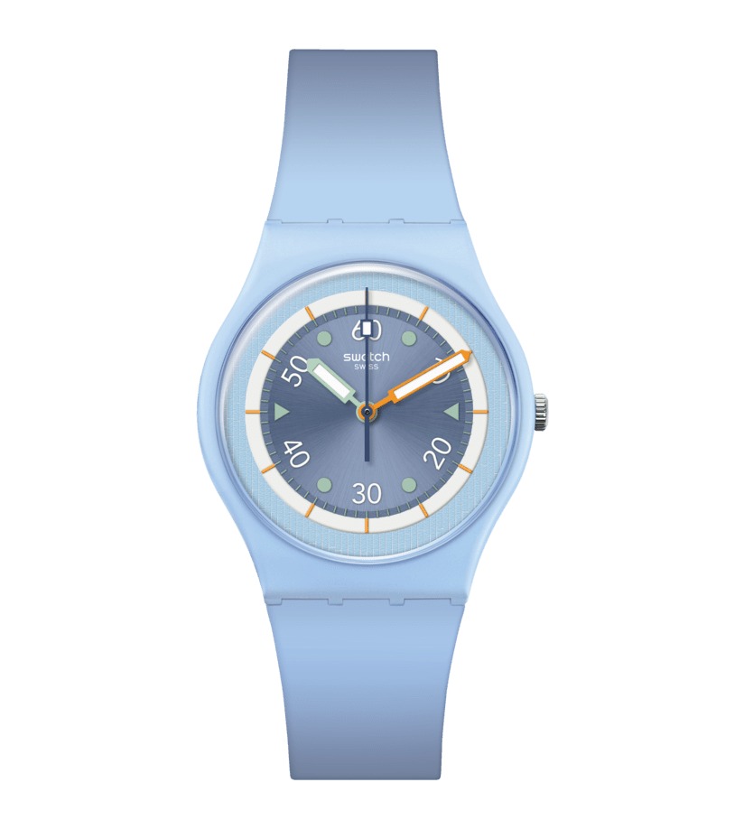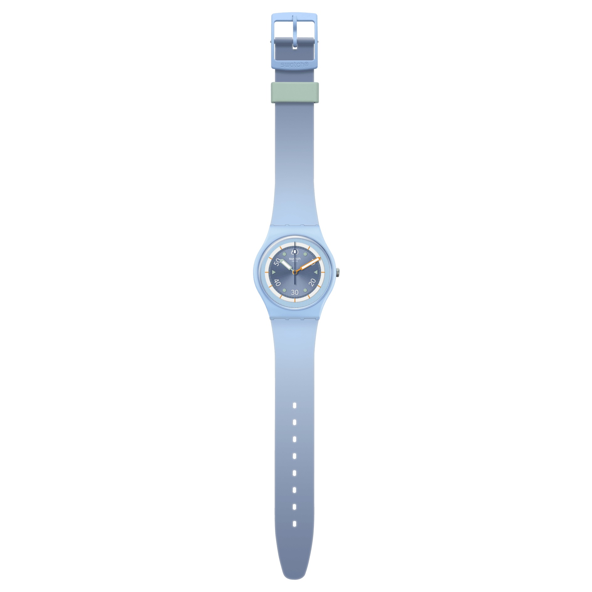 Questo orologio sui toni del blu è caratterizzato da un quadrante blu con stampe bianche, arancioni e verdi e dettagli fosforescenti. La cassa in BIOCERAMIC è azzurra con vetro biosourced. La lancetta verde delle ore, quella arancione dei minuti e quella blu dei secondi si illuminano al buio. Il passante verde opaco sul cinturino blu sfumato e opaco fa risaltare i dettagli del quadrante dell'orologio.