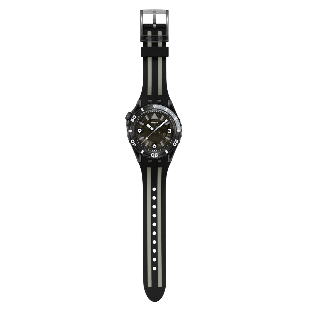 Il quadrante nero trasparente di questo orologio subacqueo presenta indici stampati in grigio, numeri stampati in bianco, lancette delle ore e dei minuti nere e lancetta dei secondi grigia, che si illuminano al buio, sotto un vetro biosourced. La cassa combina materiale Bioceramic nero opaco e materiale biosourced nero lucido ed è abbinata a una lunetta biosourced nero lucido con stampa grigia e bianca che si illumina al buio e a una corona in Bioceramic nero opaco a ore 10. Completano l'orologio un cinturino nero opaco e nero trasparente opaco con un passante nero opaco e una fibbia ad ardiglione in materiale biosourced nero trasparente lucido.