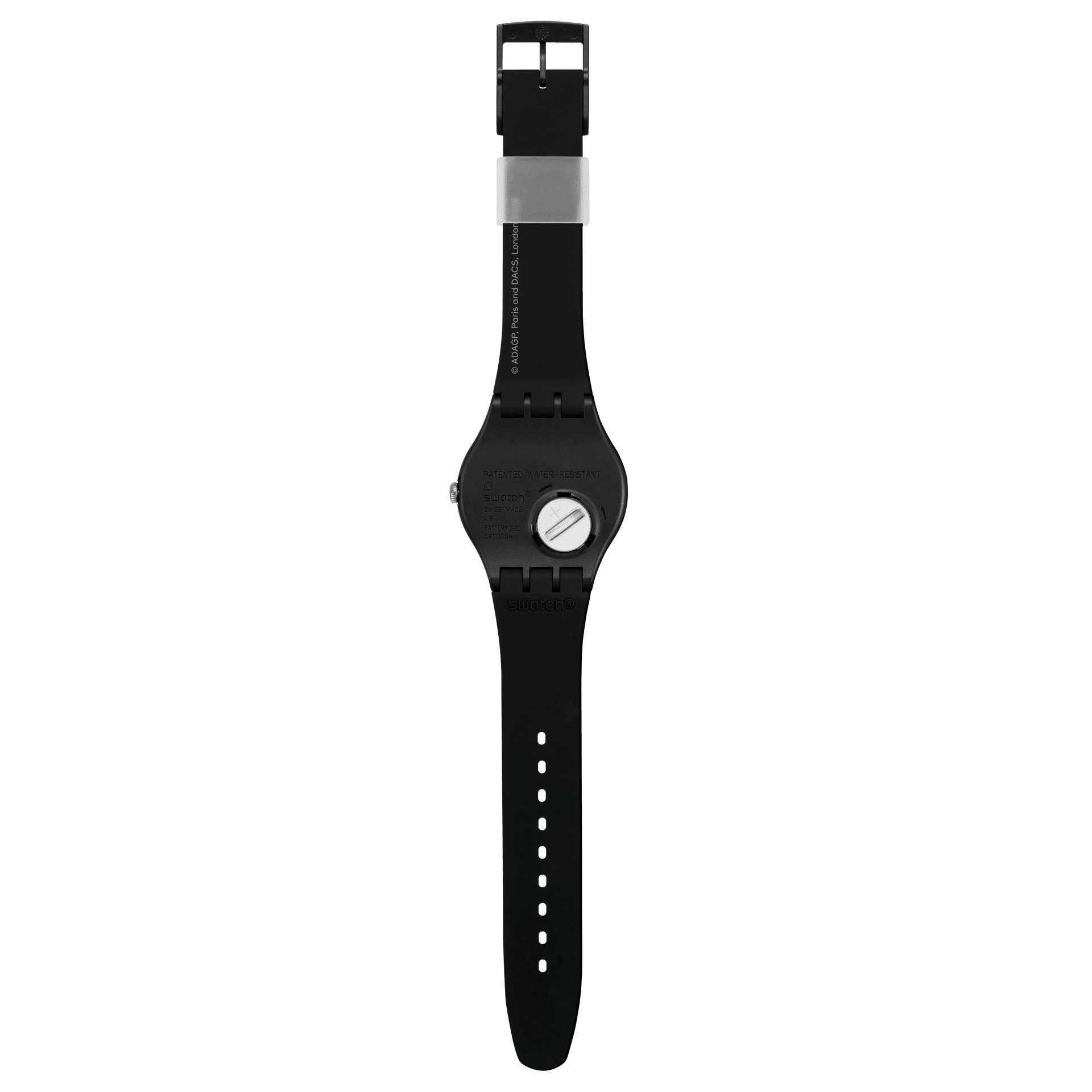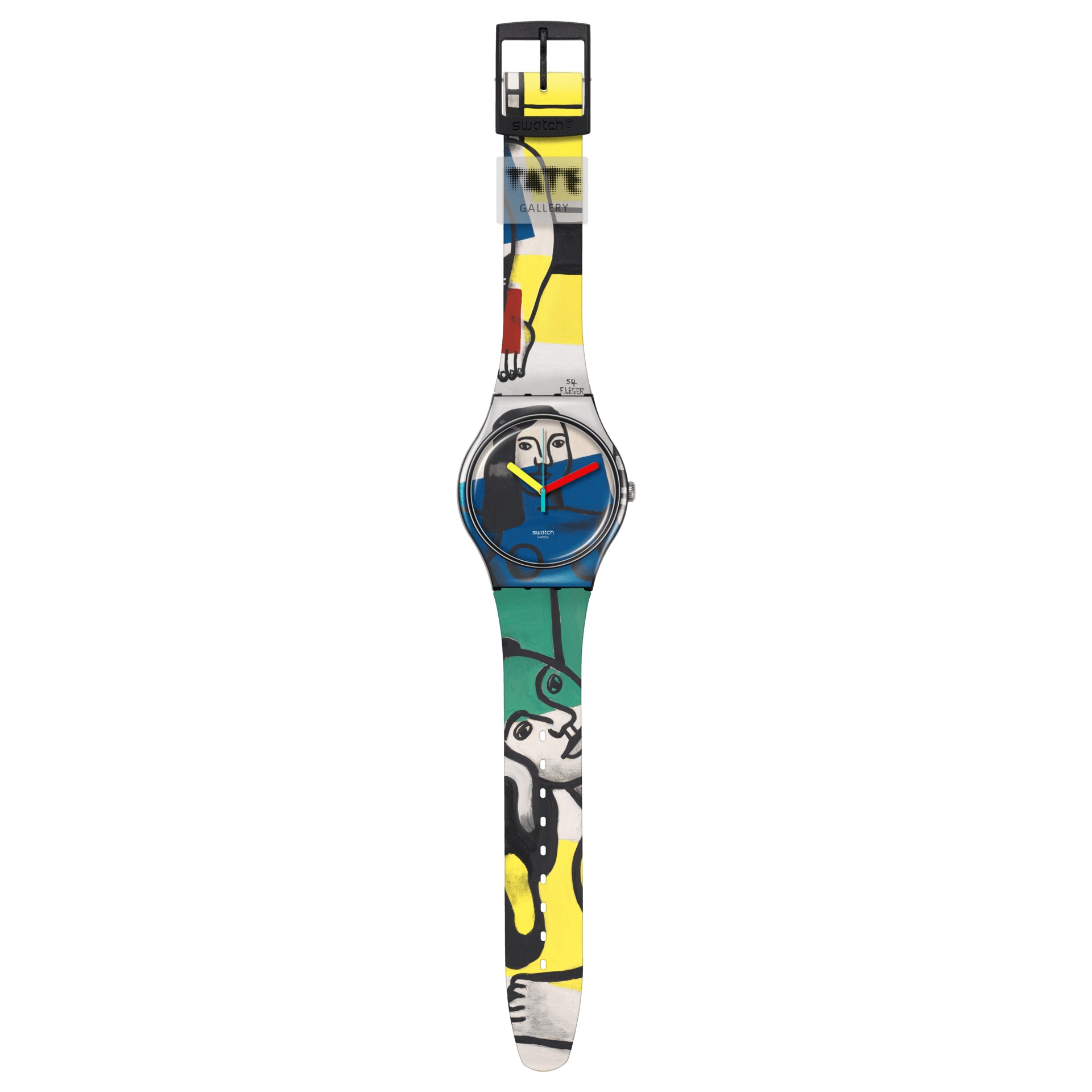 Questo orologio della Swatch x Tate Gallery Collection presenta una stampa dell'opera d'arte Two Women Holding Flowers (Due donne con fiori in mano) di Fernand Léger sul quadrante e cassa e cinturino neri opachi. La lancetta delle ore gialla, quella dei minuti rossa e quella dei secondi verde mostrano l'ora. Il passante trasparente opaco è stampato con il logo della Tate Gallery.